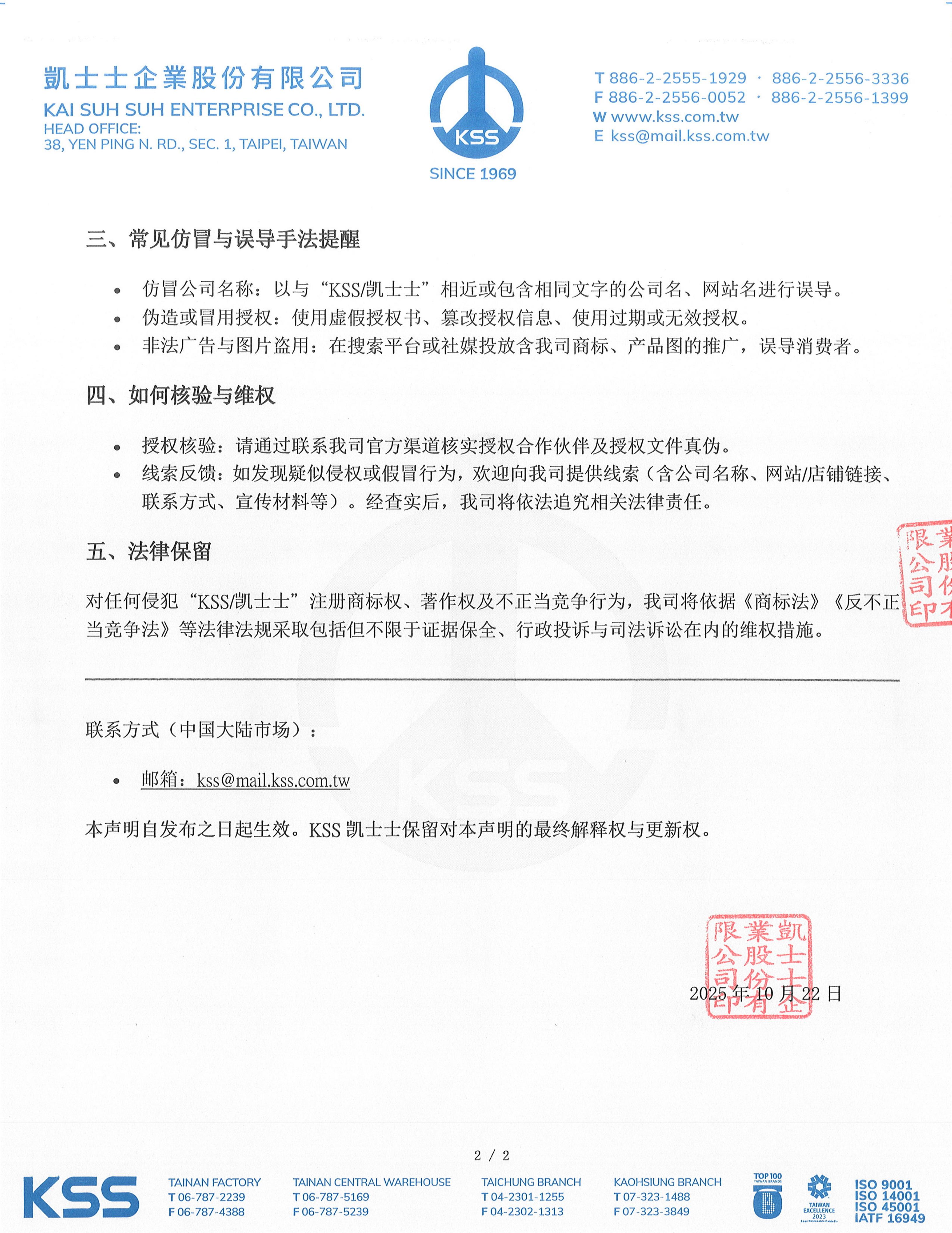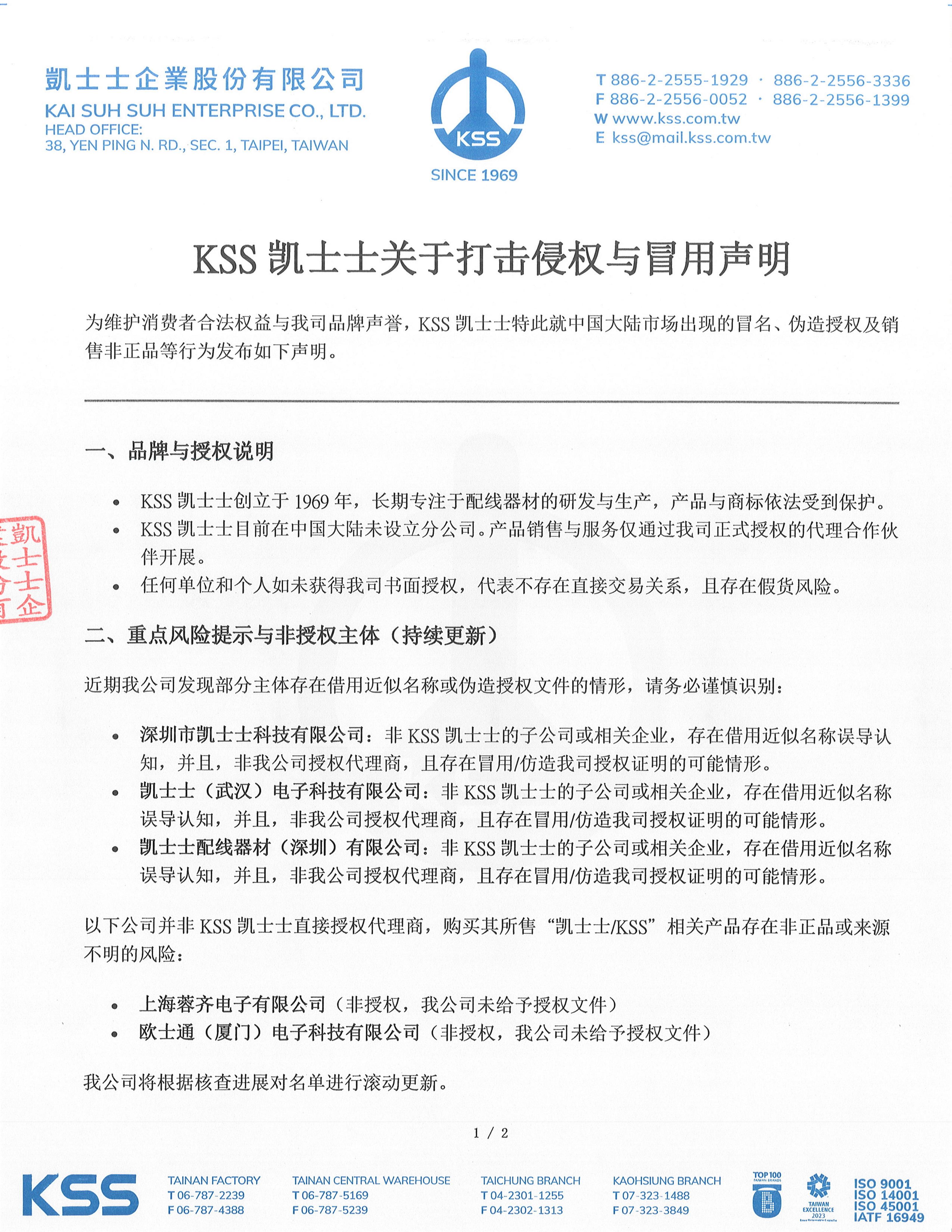 联系方式(中国大陆市场): · 邮箱:kss@mail.kss.com.tw 本声明自发布之日起生效。KSS凯士士保留对本声明的最终解释权与更新权。 凯士士企业股份有限公司 2025年10月22日